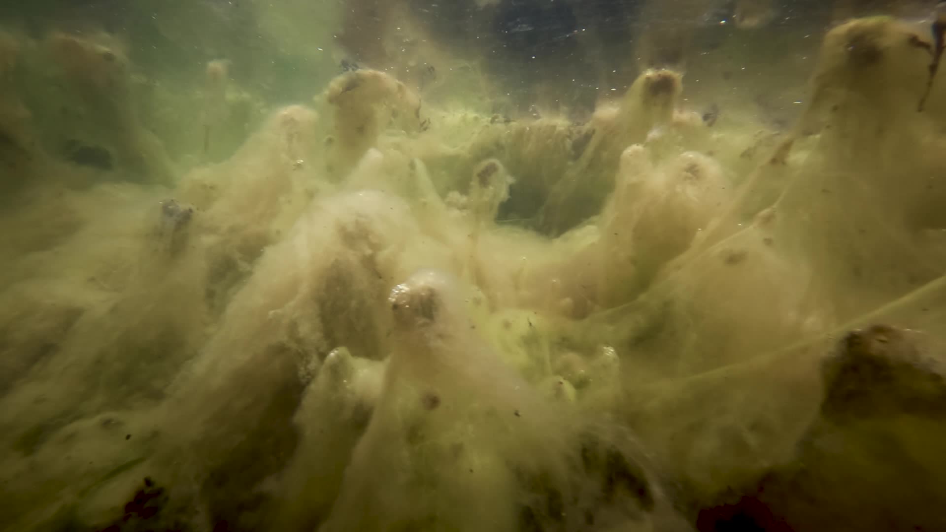 Nede ved festestrukturen, som likner røtter, sitter skjell og sekkdyr. Børstemark og små krepsdyr kryper mellom forgreiningene.